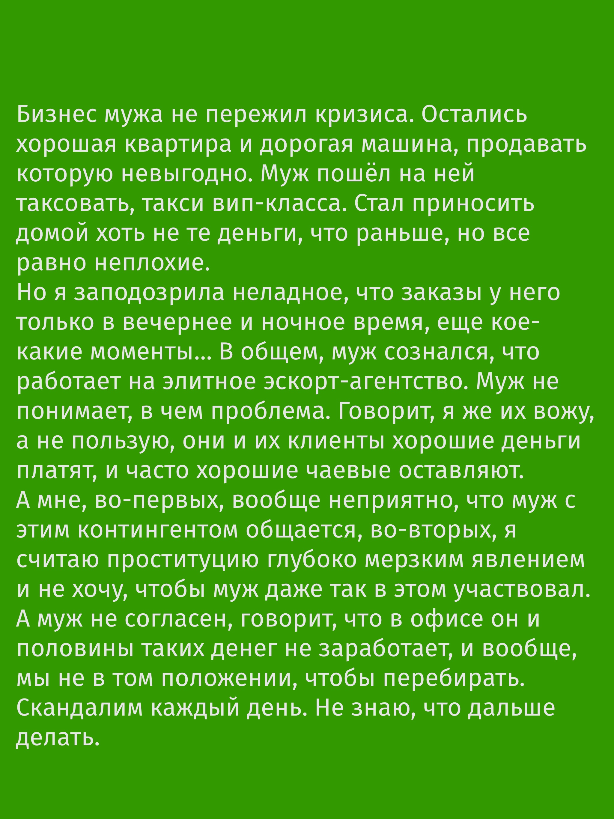 My husband's business didn't survive the crisis. All we were left with was a nice apartment and an expensive car, which it didn’t make any financial sense to sell, so my husband started driving it as VIP transportation for hire. He started bringing in good money — not like before, but definitely nothing to sneeze at.
